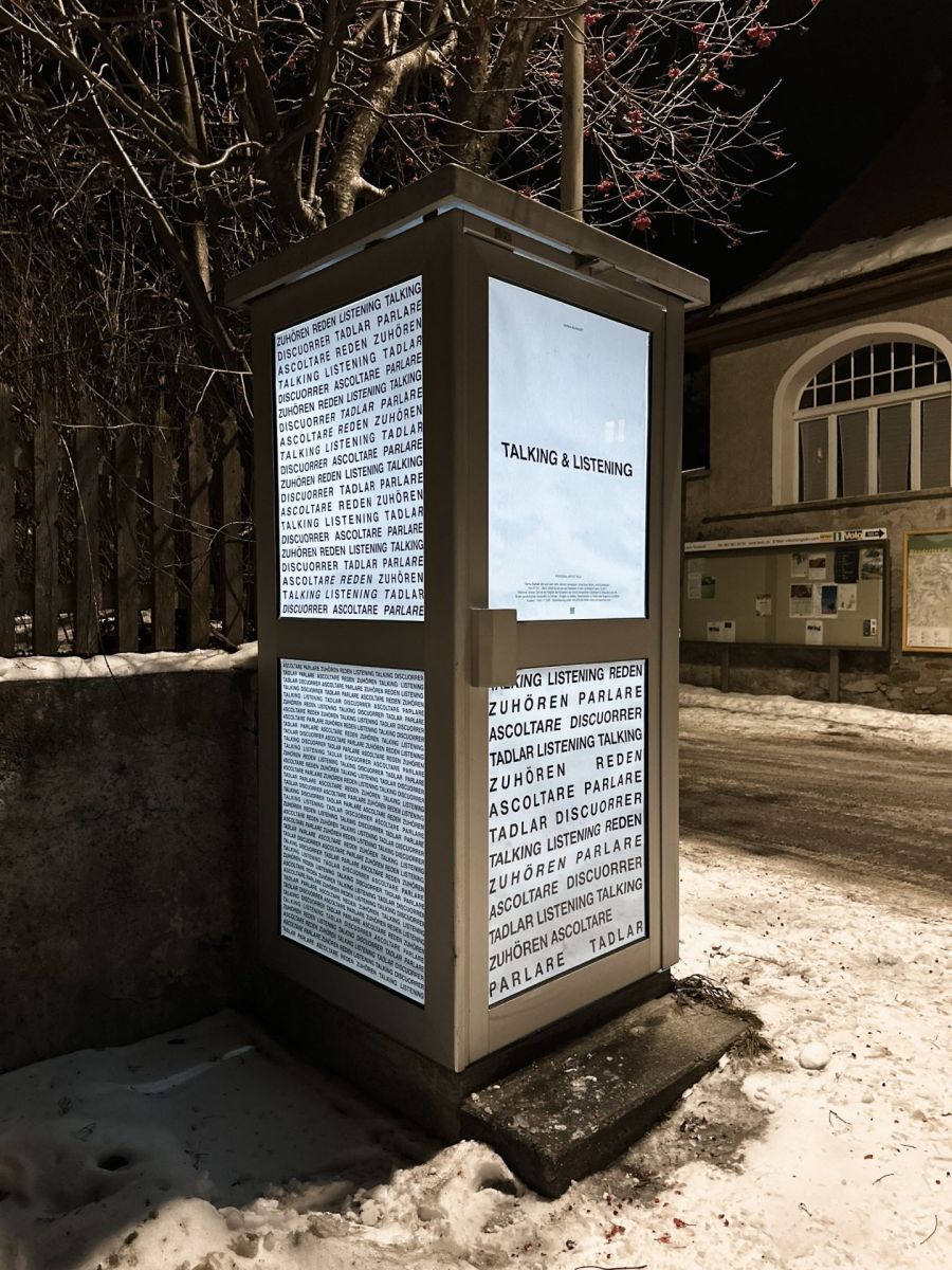 A Lavin daja üna cabina da telefon immez cumün. Telefonar nu’s poja fingià lönch na plü in quella. Pel mumaint vain la cabina dovrada sco spazi artistic. L’artista austriaca Hanna Burkart tematisescha cun sia lavur «Talking&Listening» il discuors consciaint.