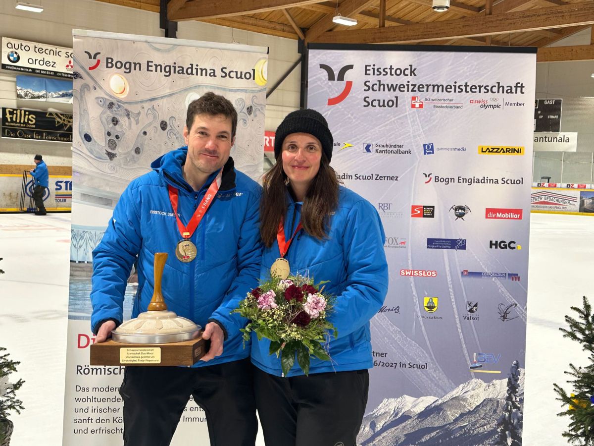 Claudio Mathieu und Marina Bott gewinnen die Eisstock Schweizermeisterschaft in Scuol (Foto: Nicolo Bass